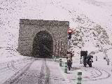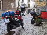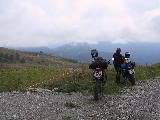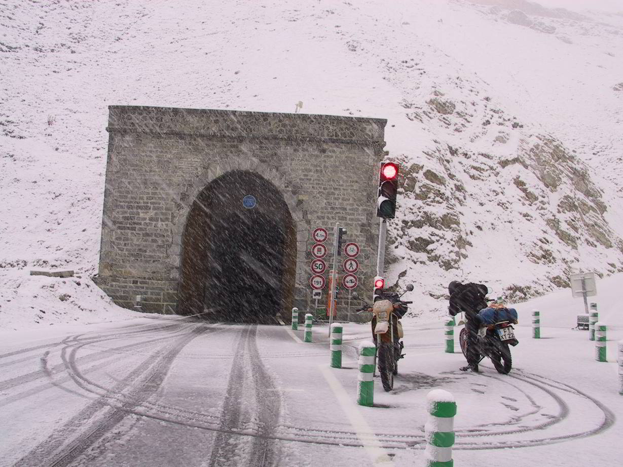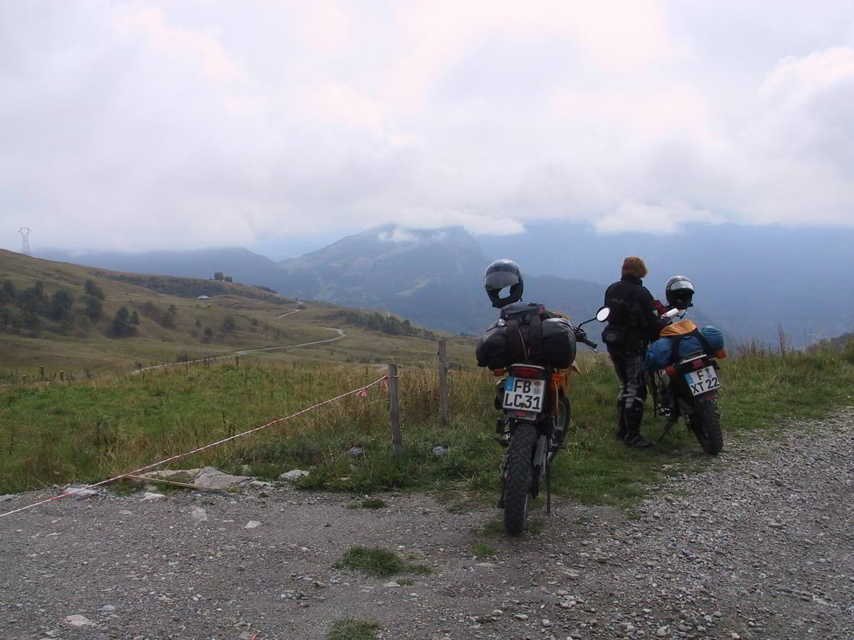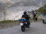 Nach der Übernachtung in Valloire wurde das Wetter immer schlechter: Paßhöhe am Galibier gesperrt! Als wir hochfuhren ließ die Straßenmeisterei unten schon die Schneepflüge warmlaufen. Für Enduros kein Problem, aber uns kamen noch gutgelaunte Yogis entgegen. |