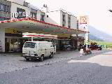 Das ist die Tankstelle aus dem James Bond Film “Goldfinger” mit Sean Connery und Gerd Fröbe. Hier bekam Tilly Masterson (Tania Mallet), die vorher am Furkapass auf Bond geschossen hat, neue Reifen. |