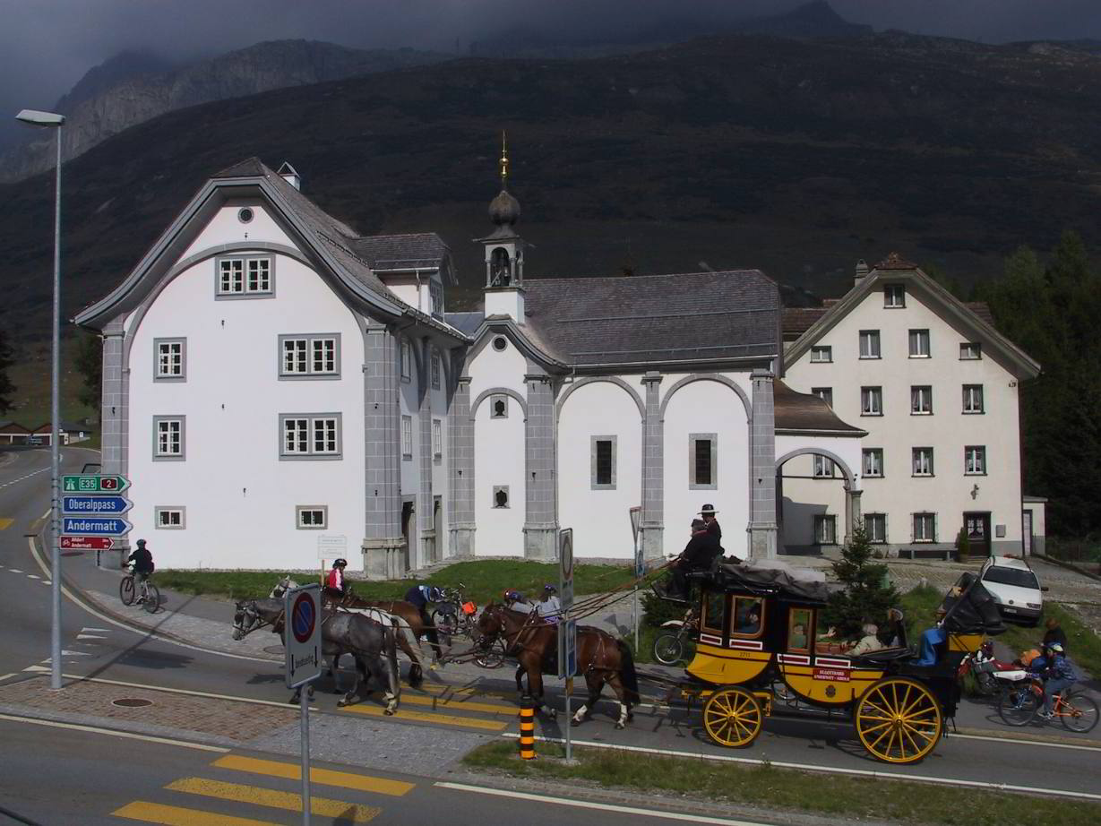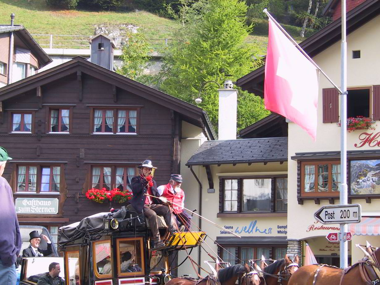 Nach der Übernachtung in Churwalden ging es über den Oberalppaß nach Andermatt, wo wie auf Bestellung die historische Gotthardpost auf uns wartete. Hier bläst gerade der Postillion zur Abfahrt. |