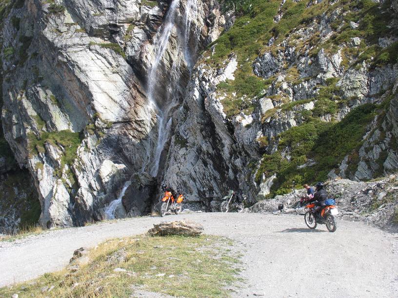 Schöne Kehre auf der Abfahrt mit Wasserfall. |
